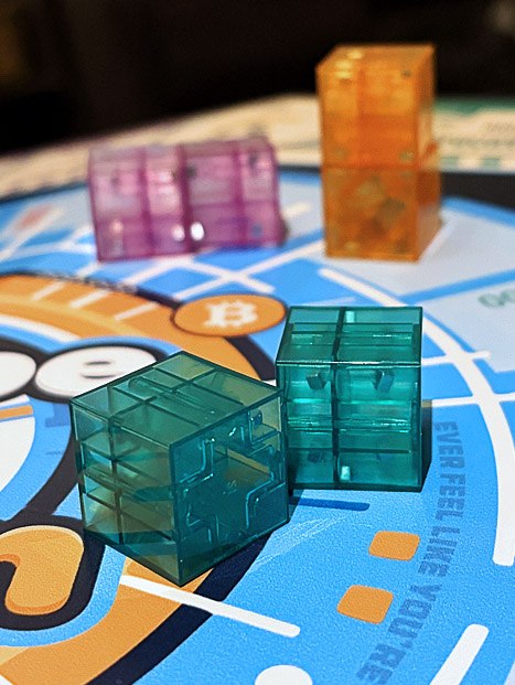 Each player has two of these amazing little Blocks to navigate from the FIAT Path to the Bitcoin Path. You can use either to maximise the strategic move of each dice roll. Connect them to double rewards or ‘Blockchain’ other players to cause a little disruption to their plans!
